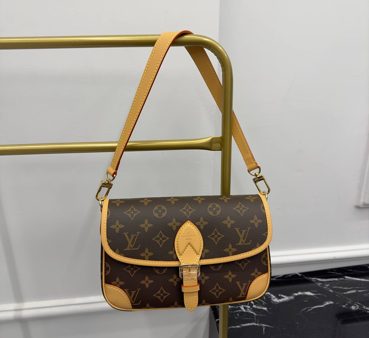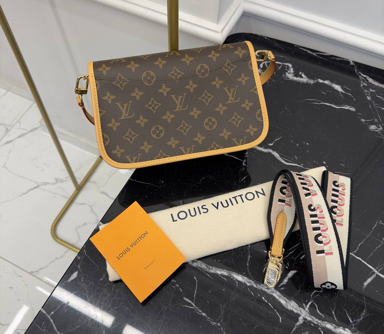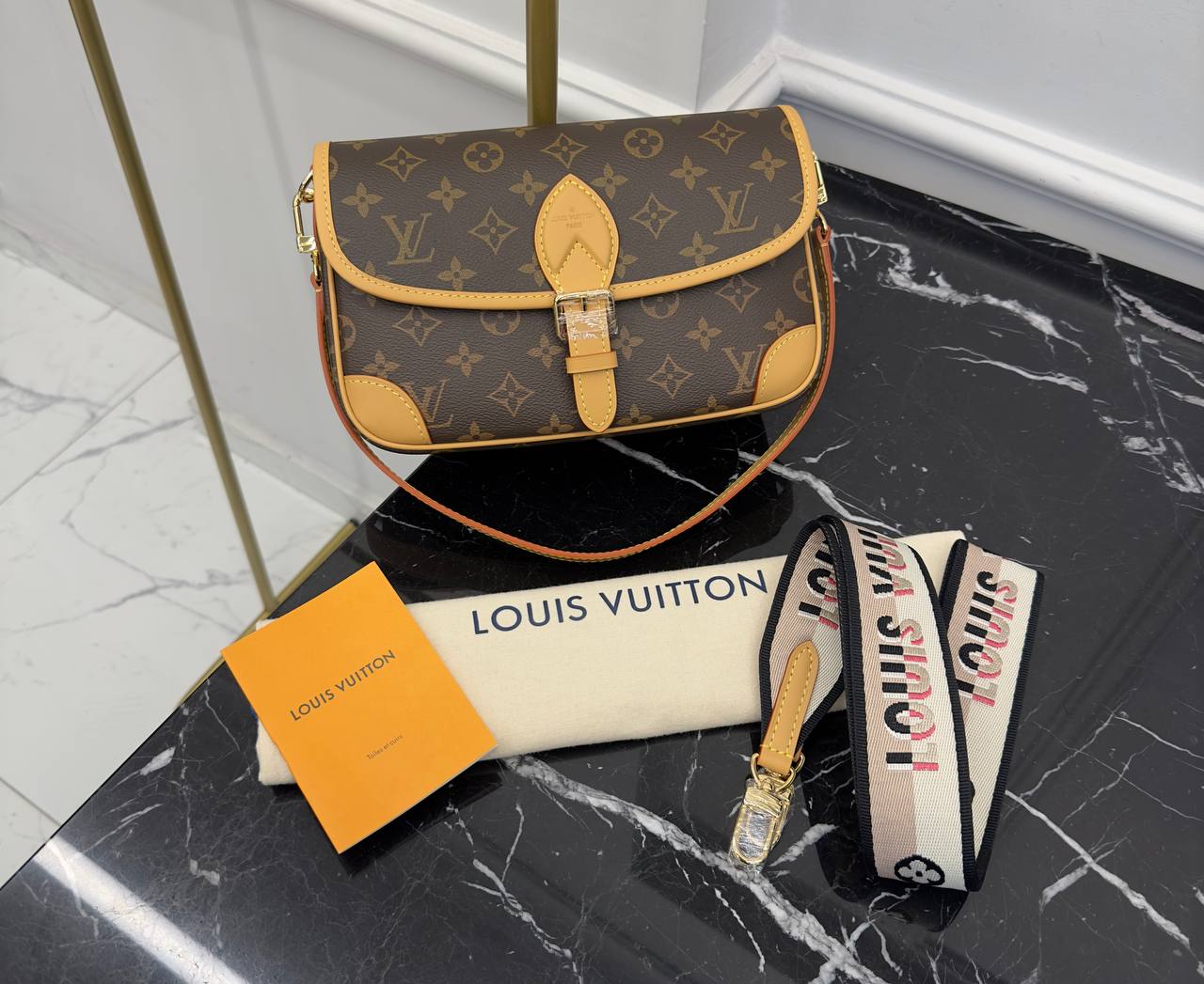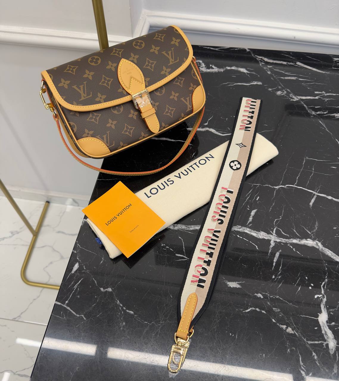 Besonders vielseitig: Die Diane kommt mit zwei Riemen – einem klassischen Lederhenkel und einem breiten, gestreiften Stoffriemen mit Louis Vuitton-Schriftzug. So kannst du sie je nach Stimmung und Outfit lässig crossbody oder elegant über der Schulter tragen.