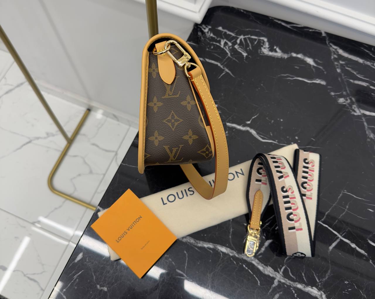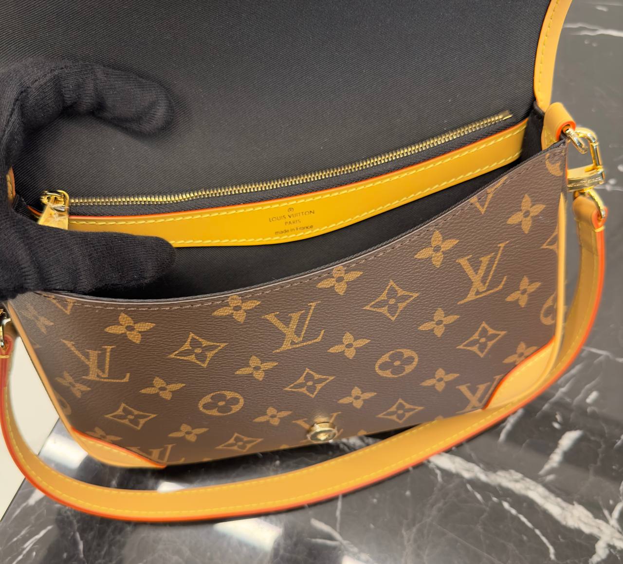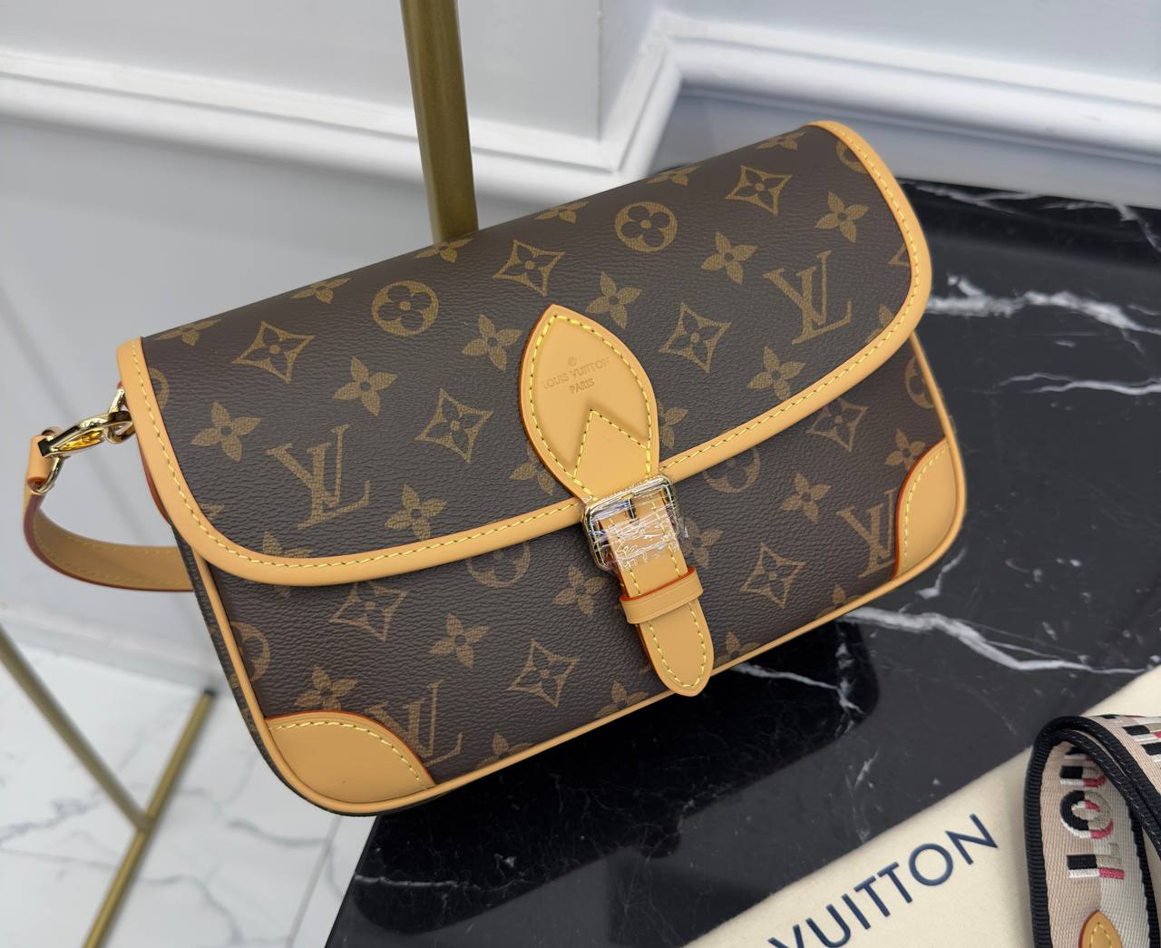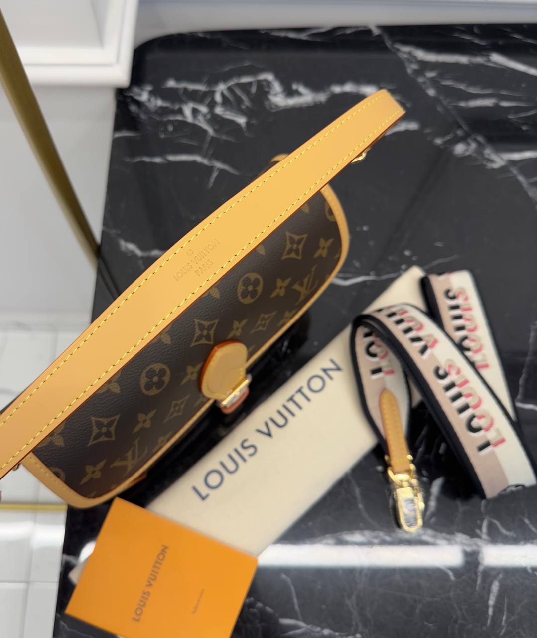 Besonders vielseitig: Die Diane kommt mit zwei Riemen – einem klassischen Lederhenkel und einem breiten, gestreiften Stoffriemen mit Louis Vuitton-Schriftzug. So kannst du sie je nach Stimmung und Outfit lässig crossbody oder elegant über der Schulter tragen.